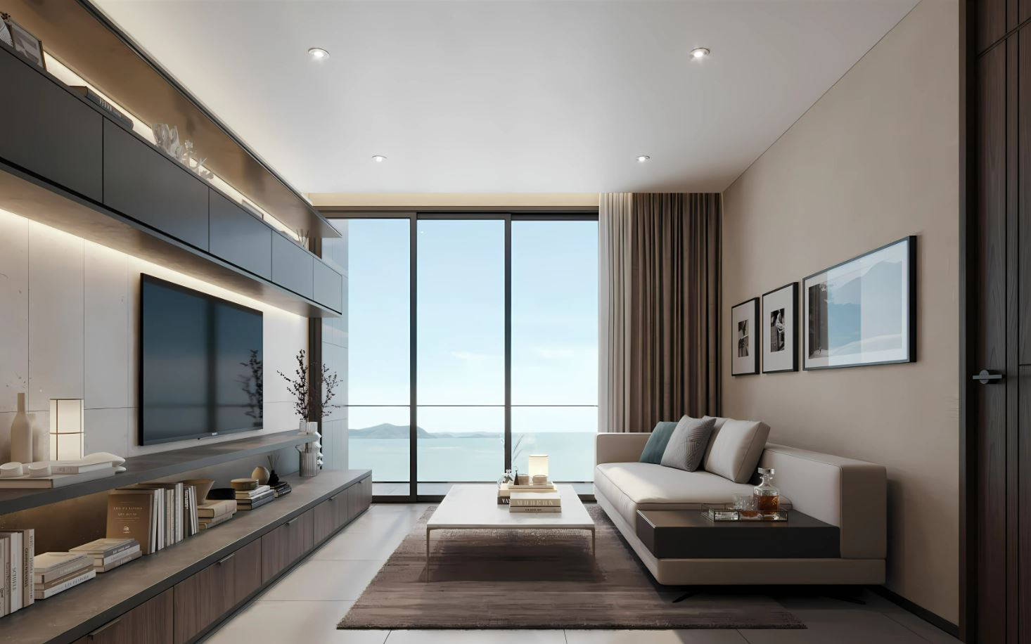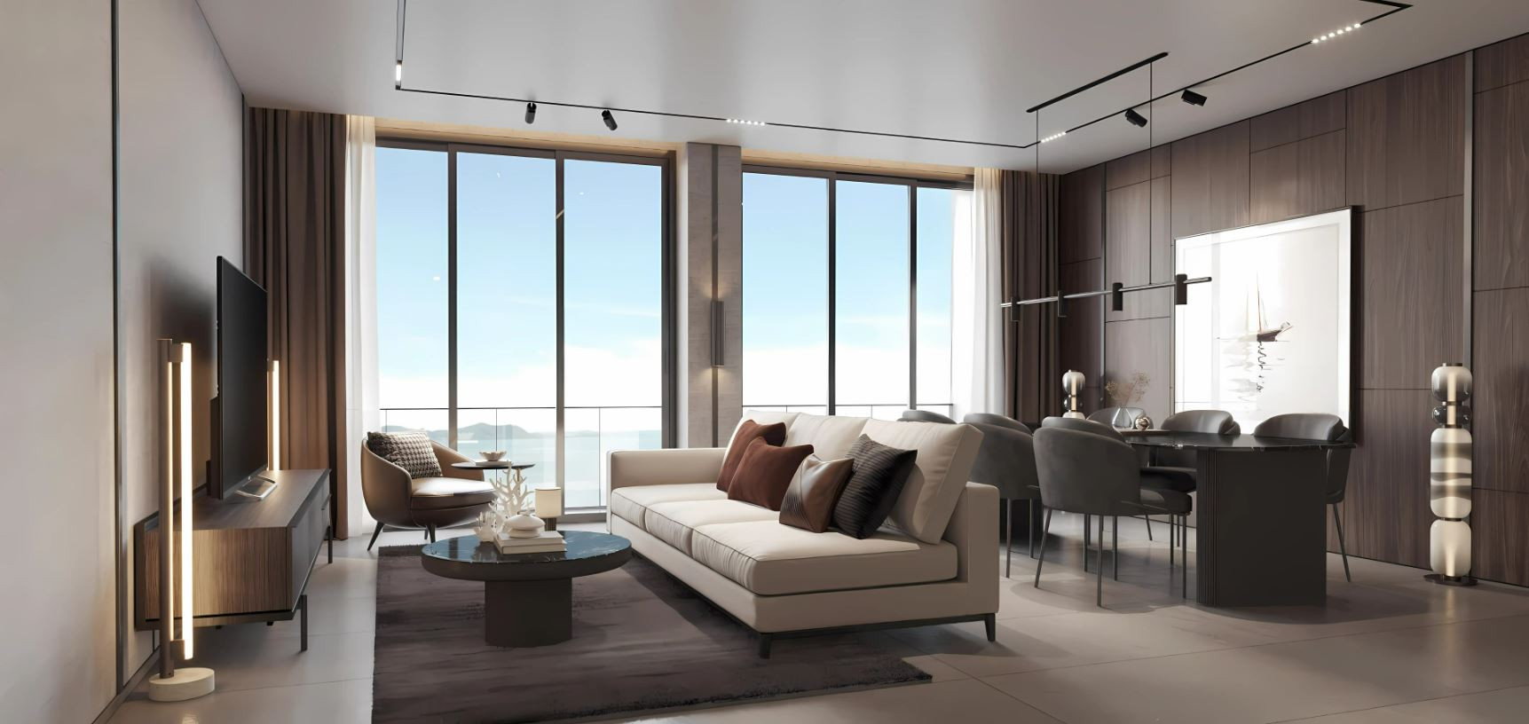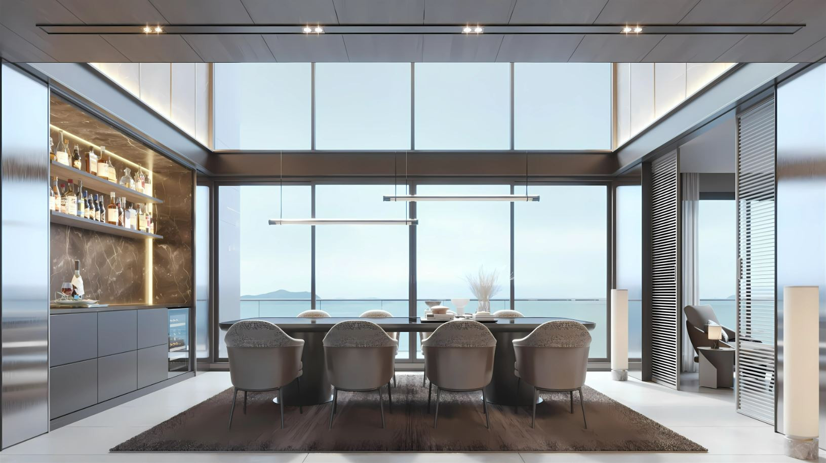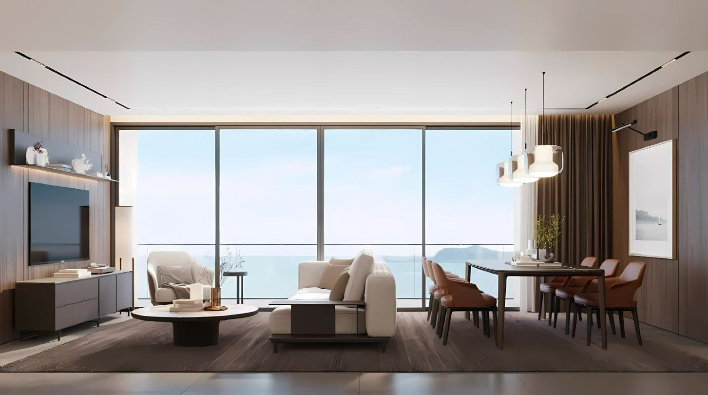 The interiors feature high-quality ceramic tile flooring, creating a clean and durable base throughout the space. Zoned ceiling lighting subtly defines each area, while panoramic glazing fills the rooms with natural light and opens wide views, enhancing the overall sense of space.