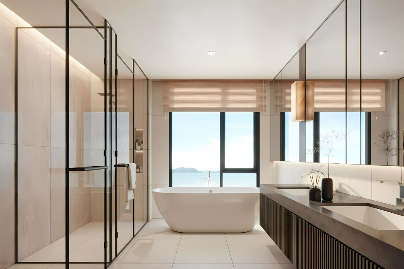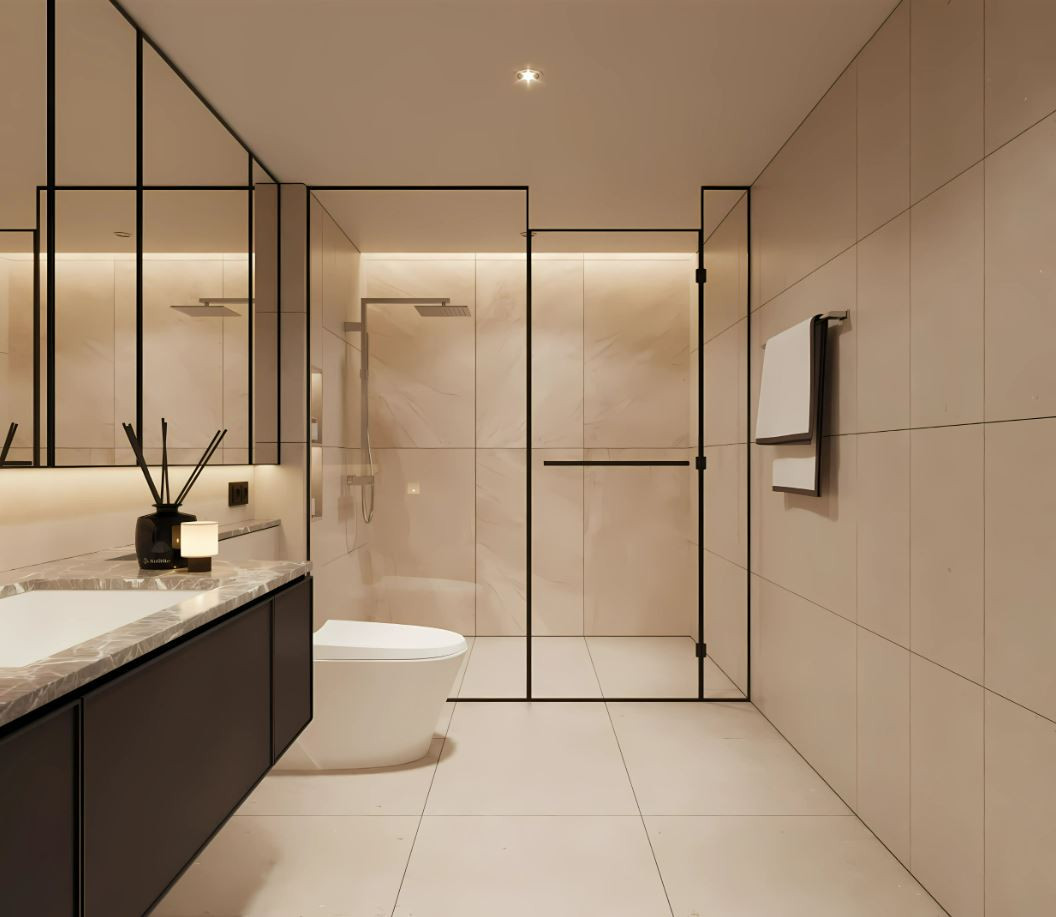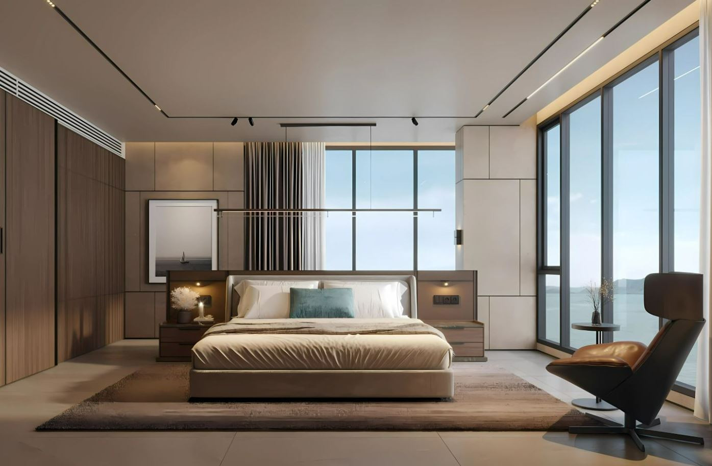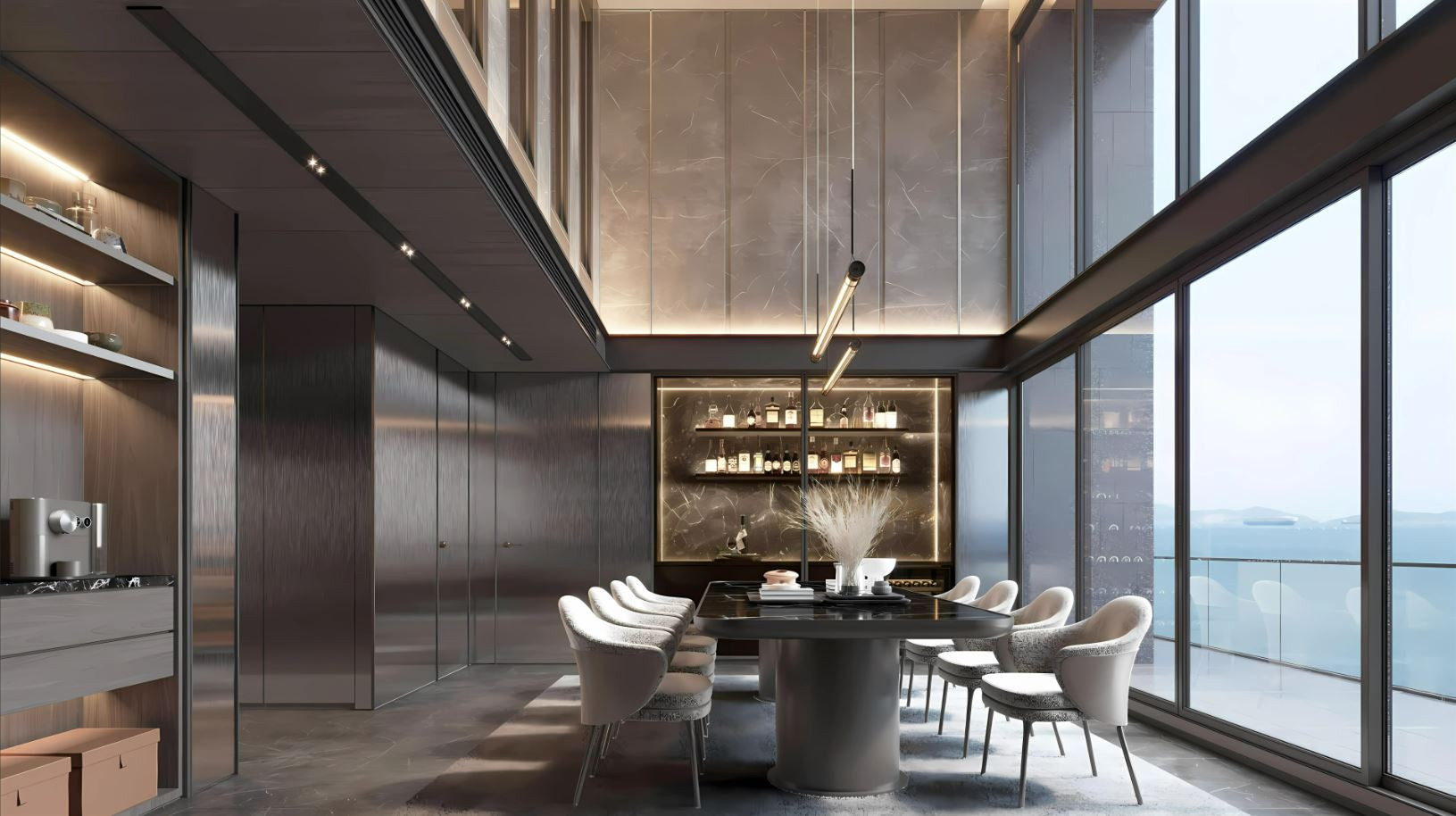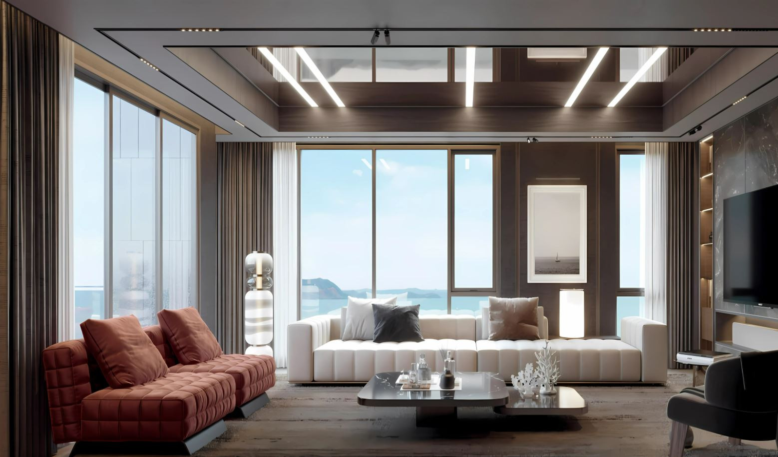 The interiors feature high-quality ceramic tile flooring, creating a clean and durable base throughout the space. Zoned ceiling lighting subtly defines each area, while panoramic glazing fills the rooms with natural light and opens wide views, enhancing the overall sense of space.