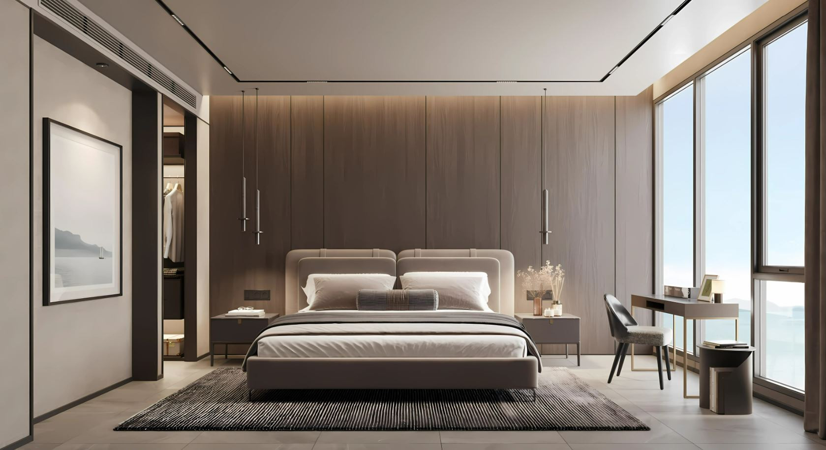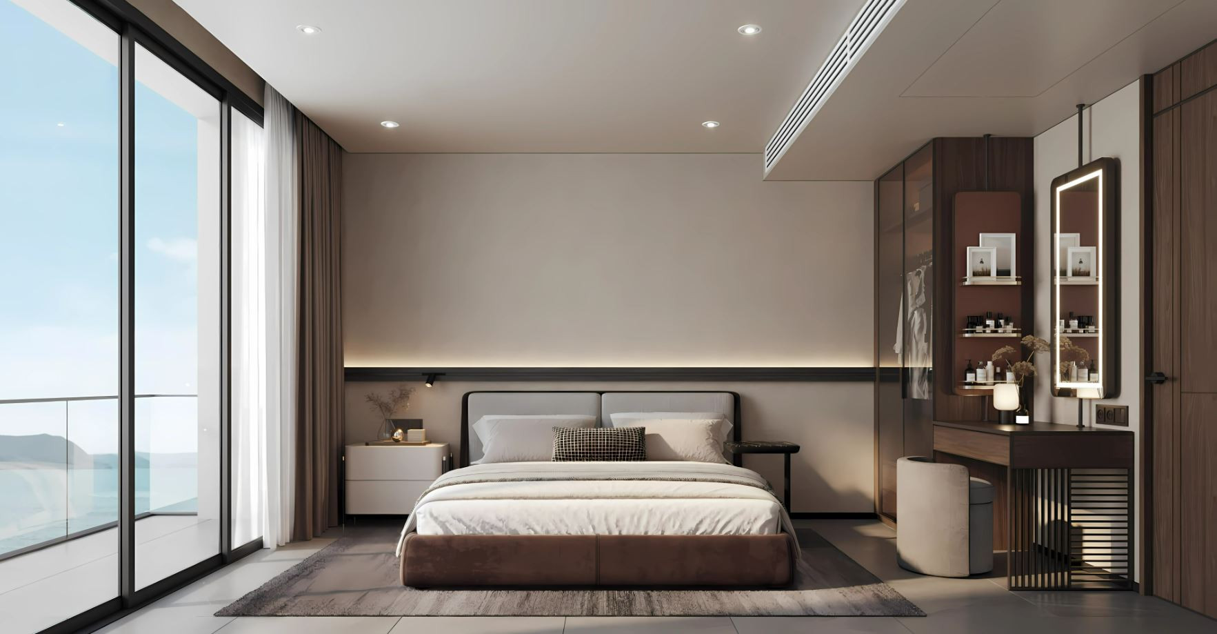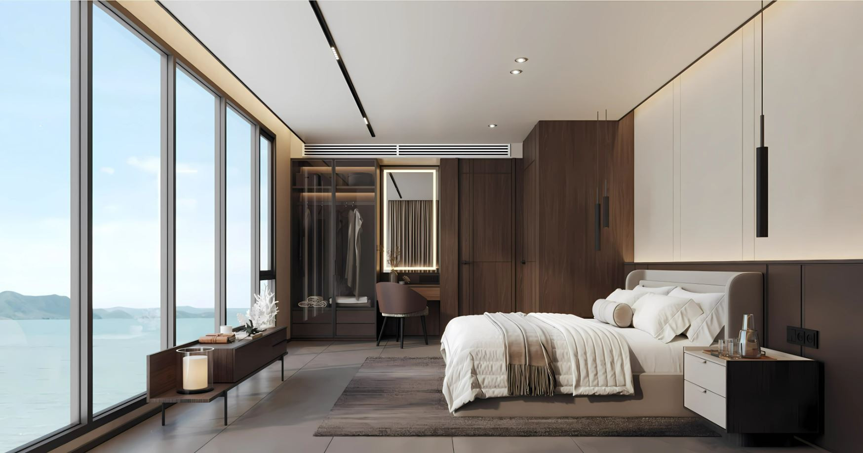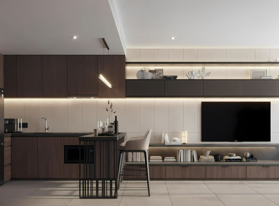 The interiors feature high-quality ceramic tile flooring, creating a clean and durable base throughout the space. Zoned ceiling lighting subtly defines each area, while panoramic glazing fills the rooms with natural light and opens wide views, enhancing the overall sense of space.