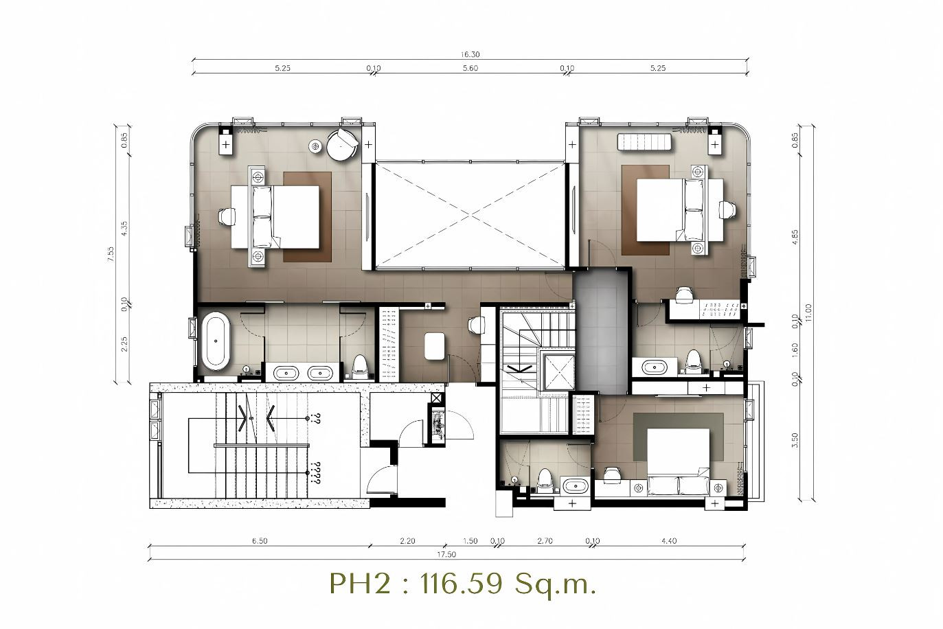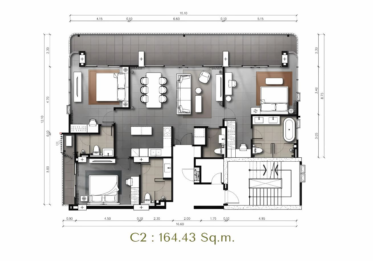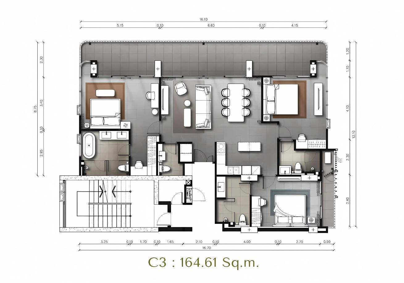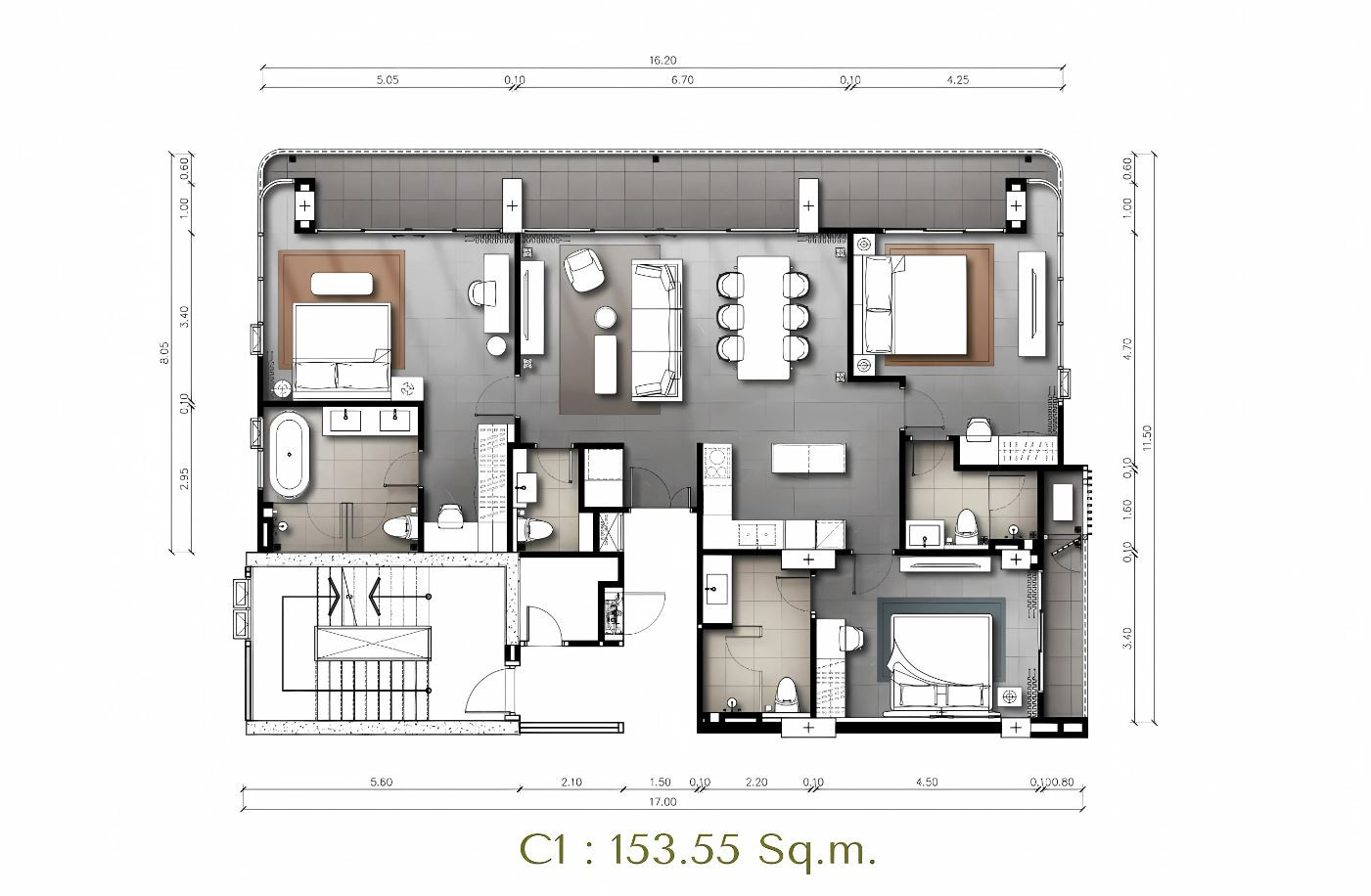 The interiors are furnished with stylish wardrobes and beds with king size or queen size mattresses in every bedroom. Living areas include a modern high-quality sofa and coffee table, and bedside tables, while dining spaces feature a table with chairs. European built-in kitchen furniture and high-quality sanitary ware complete the setup.
